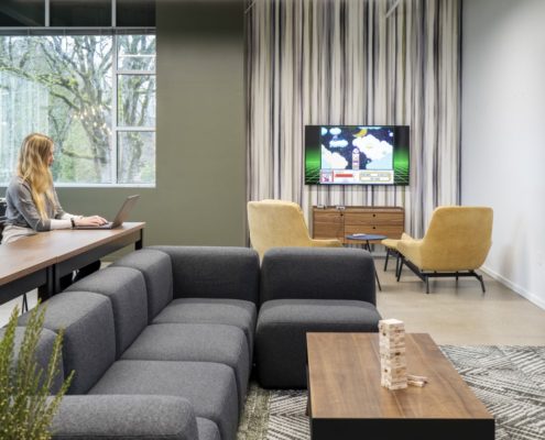 Located in Tigard, 20 minutes from downtown Portland, The Partners Group moved across the street to expand and update its 30-year-old brand to a Pacific Northwest lodge concept space. The 33,000-square-foot office encompasses two floors with open workspaces, private offices, breakout conference rooms, a game/lounge room, and a concept living room area adjacent to the board room, which can transform into a large entertaining space.