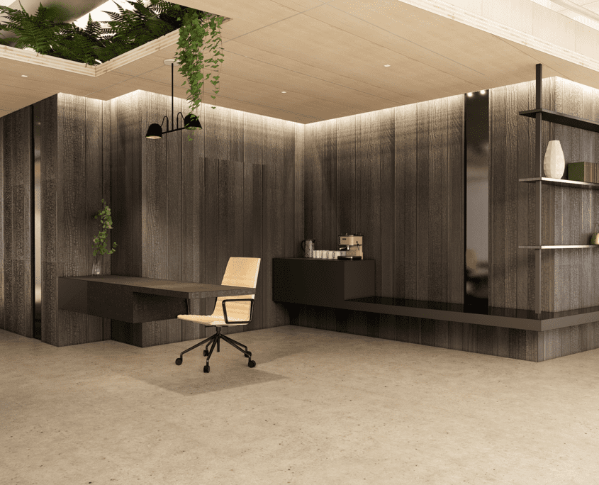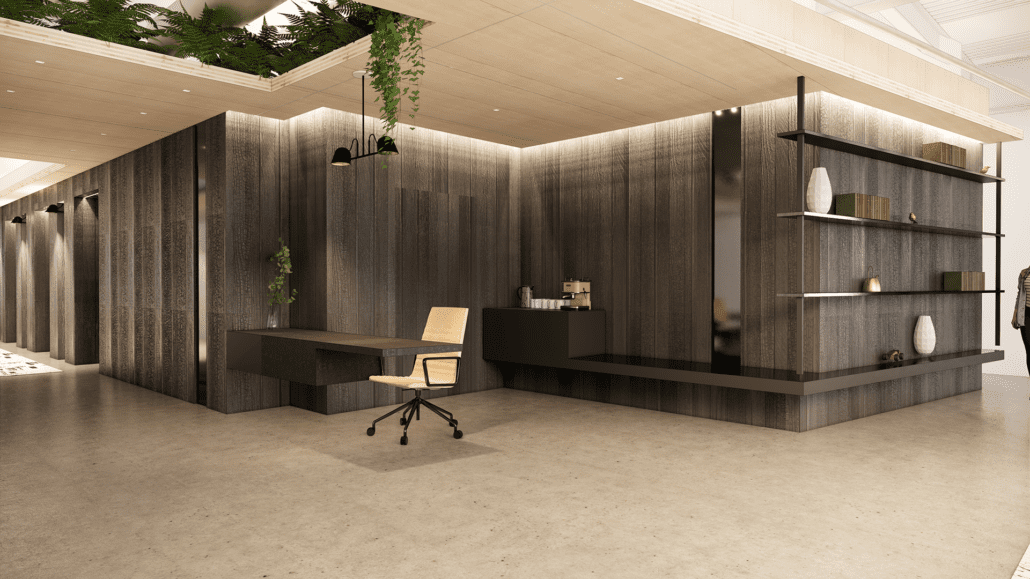 The new Campbell Global office space sits on the 32nd floor in the Wells Fargo Tower. Campbell Global, a timber investment company, wanted to showcase multiple wood elements throughout the office to highlight their business. GBD Architects captured this idea in a beautiful design, creating a unique and high end space for Campbell Global. The main wood elements featured within the project are the CLT panel ceiling clouds, furnished and installed by Swinerton Mass Timber. Mass Timber played an integral role by bringing their knowledge & expertise of CLT to the unique feature element. The Swinerton self-perform Drywall team was also a key contributor. Collaboration between the management and drywall teams early on resolved a majority of the site questions & layout issues resulting in increased efficiencies and smooth project flow.