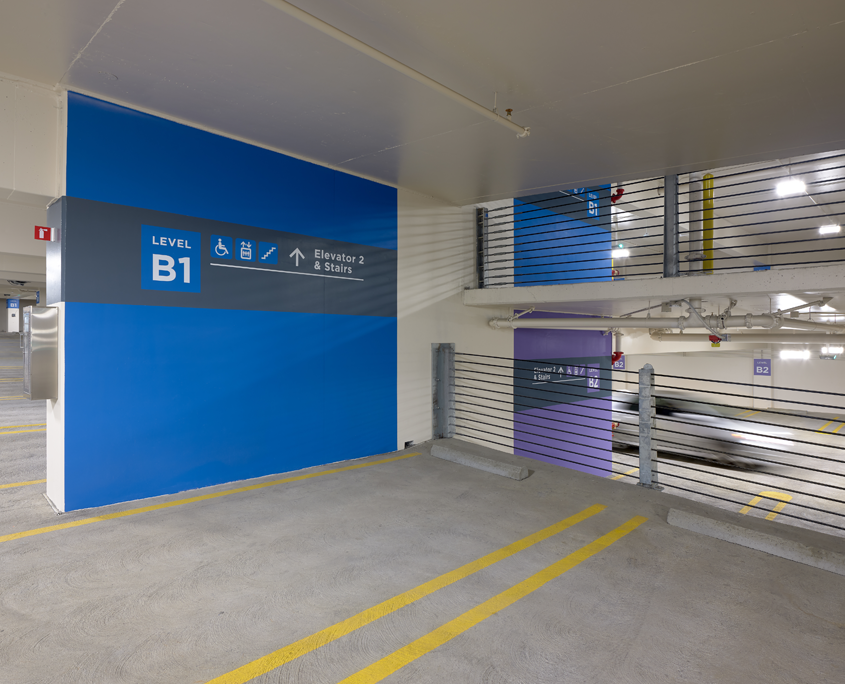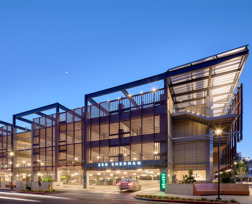 Elaborate exterior, 3,000 sf custom translucent canopy, Extensive bio-retention stormwater planters, State-of-the-art parking control sys-tems